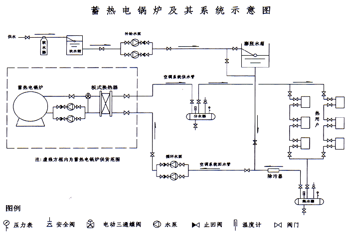 蓄熱電鍋爐配以蓄熱水箱及附屬設(shè)備即構(gòu)成蓄熱式電鍋爐系統(tǒng)。在電網(wǎng)低谷時(shí)段開啟電鍋爐將水加熱并儲(chǔ)存在水箱中,在電網(wǎng)高峰時(shí)段關(guān)閉電鍋爐。利用蓄熱水箱中的熱水采暖,達(dá)到全部使用低谷電力(全蓄熱式)或部分使用低谷電力(半蓄熱式)供熱的目的。
